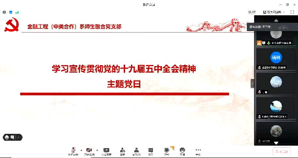 11月25日,365上市公司金融工程(中美合作)系师生融合党支部召开学习贯彻党的十九届五中全会精神主题党日活动,会议由党支部书记王江盼主持。