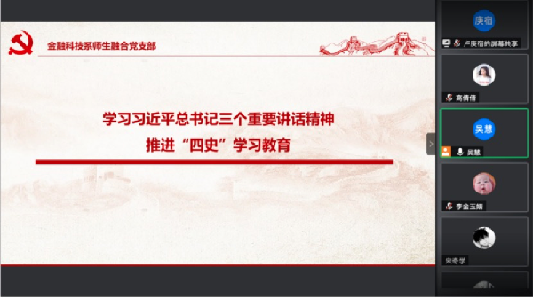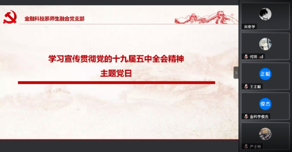 为深入学习贯彻党的十九届五中全会精神,11月25日,365上市公司金融科技系师生融合党支部组织开展专题党日活动,学习党的十九届五中全会精神,学习习近平总书记三个重要讲话精神,扎实推进“四史”学习教育,会议由党支部书记吴慧主持。