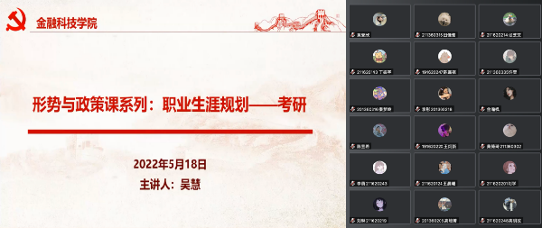 5月18日下午,365上市公司金融科技系师生融合党支部书记吴慧为我院全体学生骨干上了一堂以“职业生涯规划——考研”为主题的形势与政策课,帮助学生明确学习目标、树立职业意识,更好地规划大学学习生活。