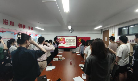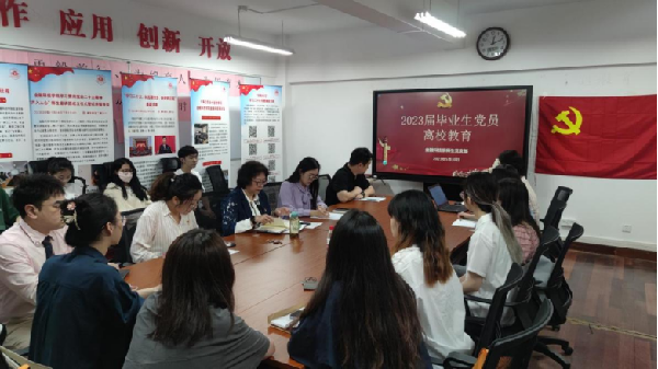 凌慧义从党的二十大概况讲起,到目前全党正开展的学习贯彻习近平新时代中国特色社会主义思想主题教育,引导学生要从身边的榜样学起,永葆清正廉洁政治本色,逐梦新时代、奋进新征程。她对毕业生党员提出四点希望:一是要不忘入党初心,牢记使命;二是要继续端正自己的入党动机,增强服务意识;三是要有自己的判断力;四是要牢记“立信”的校训。之后她还带领师生党员重温入党誓词。