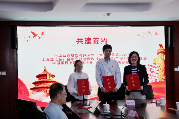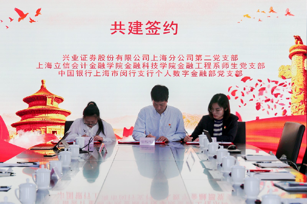 在与会人员的共同见证下,金融工程系师生党支部与中国银行上海市闵行支行个人数字金融部党支部、兴业证券股份有限公司上海分公司第二党支部签署了《党建共建协议》。