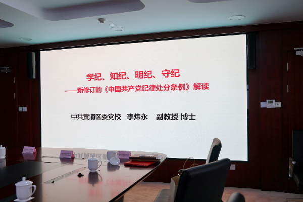 会上,中共黄浦区委党校副教授、博士李炜永以“《学纪、知纪、明纪、守纪——新修订的《中国共产党纪律处分条例》解读”为题讲授党课。他强调党员干部需时刻自重自省,在强化“以案为鉴”上持续用力。要以学习贯彻新修订的纪律处分条例为契机,加强纪律教育,坚持正面引导和反面警示相结合,运用好“身边”案例深入开展警示教育,使党员干部心有所畏、言有所戒、行有所止。