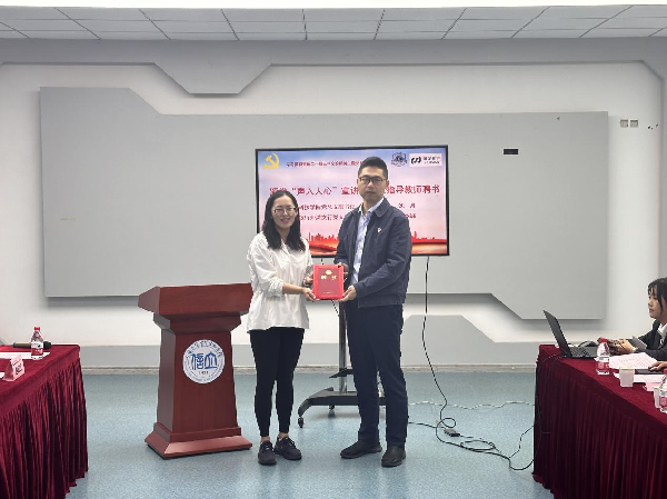 365上市公司党总支副书记、副院长沈丹为浦发银行外滩支行党支委、副行长洪杰诚颁发365上市公司党的二十大精神“声入人心”宣讲团企业指导教师聘书。