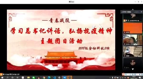 各团支部通过主题团日活动,深入学习习近平总书记在全国抗击新冠肺炎疫情表彰大会上的重要讲话,17级1班、18级金科2班、20级金科2班、20级金工(中美合作)1班等班级以回顾学习大会视频、组织同学分享观后感的形式,再次见证英雄们的精彩时刻。20级金融工程2班的主讲人根据自己所学所感,发表了题为《学习近平总书记讲话肩负起历史赋予的重任》汇报演讲,以大学新生的视角,表达了当代大学生应提高政治站位,增强责任意识的必要性。