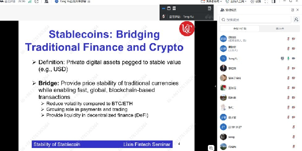 在互动交流环节,与会师生围绕稳定币的设计机制、风险表现和监管前景与Tong Yu教授展开了热烈讨论。此外,与会者还就中国数字人民币与稳定币的协同发展、DeFi生态中稳定币的应用前景、以及跨境支付中稳定币的技术优势等话题与Tong Yu教授进行了深入交流。本次沙龙在热烈的学术氛围中圆满结束。