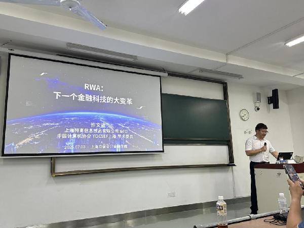 随后,许文波围绕《RWA:下一个金融科技的大变革》主题,深入剖析“现实世界资产(Real World Assets, RWA)通证化”技术路线及产业前景。他首先阐明了RWA通证化的技术逻辑:借助区块链技术和智能合约机制,将如新能源、供应链应收账款、私募股权等非标资产进行数字映射和可编程化管理,实现在链上登记、拆分、流通与清算。为帮助学生更好理解复杂机制,许文波结合多个真实案例进行了深入解析。这些案例不仅展示了RWA的技术可行性,更体现出其在金融效率提升、风险可控性增强等方面的变革潜力。