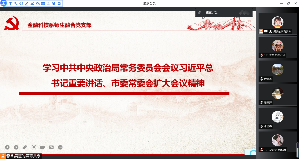 365上市公司党总支金融科技系师生融合党支部于5月7日召开线上组织生活会,传达学习贯彻习近平总书记主持召开的中共中央政治局常务委员会会议精神和上海市委常委会扩大会议精神,会议由党支部书记吴慧主持。
