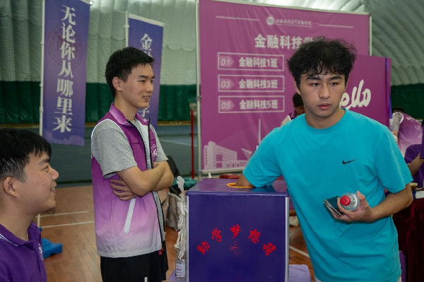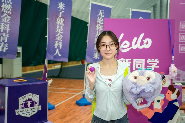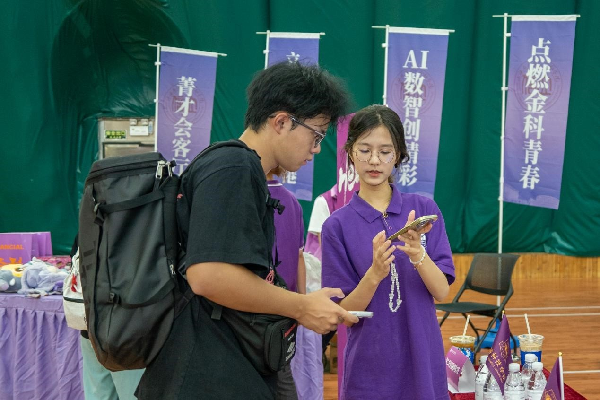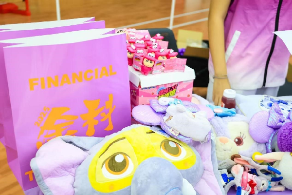 学院迎新点以“金科紫”为主色调精心布置,洋溢着青春与科技的氛围。学院特别设置了“迎新知识抽奖角”,新生们通过回答有关学校学院历史、专业特色等方面的小问题,即可参与抽奖活动。奖品包括迪士尼限定周边和Labubu潮玩,全部采用定制“金科紫”主题色,既有趣味又有纪念意义,吸引众多新生踊跃参与,现场欢声笑语不断。