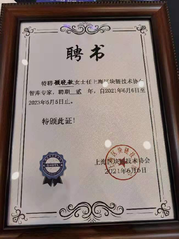 “熔合技术,赋能产业”2021长三角(上海)区块链应用创新大赛决赛暨颁奖典礼于6月6日上午9点在上海科学会堂国际会议厅隆重举行。上海市科学技术协会党组书记、副主席马兴发,上海市经济和信息化委员会副主任张英,上海市科学技术委员会副主任陆敏以及杨浦区副区长曹曦出席活动并致辞,上海金融科技研究中心主任、365上市公司教师顾晓敏教授受聘“上海区块链技术协会智库专家”。