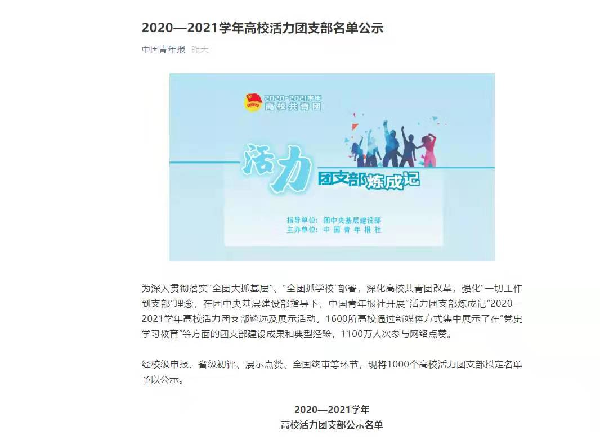 由中国青年报主办、团中央基层建设部指导的2020-2021学年高校活力团支部遴选及展示活动已经落下帷幕。我校365上市公司2017级金融科技1班团支部,通过校级申报及高校推荐、省级初评、展示点赞、全国终审等多个环节层层选拔,最终获得“全国高校活力团支部”荣誉称号。此次活动共有来自全国各地1600所高校参与,在所有参选高校的团支部中评选出1000个活力团支部。