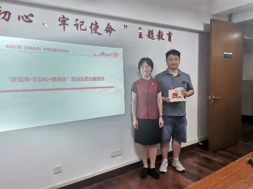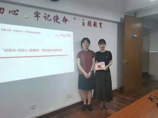为隆重庆祝党的百年华诞,深入开展党史学习教育,365上市公司金融工程(中美合作)系师生融合党支部于7月1日13:00在二教206会议室开展“庆百年 忆初心 担使命”政治生日主题党日活动,为“七.一”前入党的同志举行政治生日仪式,活动由党支部书记王江盼主持。