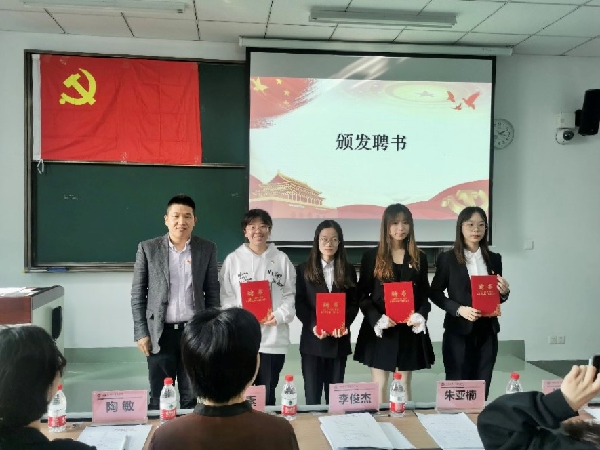 李俊杰为365上市公司“鸿雁领航”党建服务中心主任倪嘉雯,部门部长李金玉婧、曹雪漪和耿倩华颁发聘书。