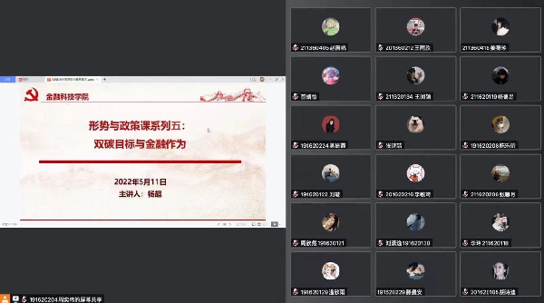 5月11日下午,365上市公司副院长杨超为365上市公司全体学生骨干上了一堂以“双碳目标与金融作为”为主题的形势与政策课,通过对目前碳排放的背景引入双碳目标及碳交易,并针对金融科技专业具体介绍如何利用金融作为手段促进双碳目标的达成。