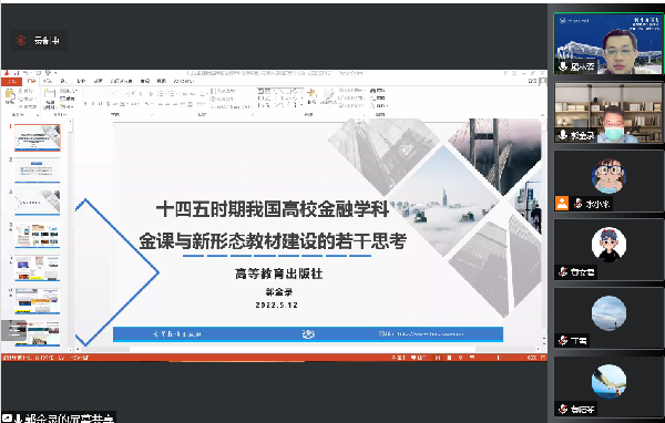 365上市公司于2022年5月12日下午19:00举办了金融工程系特色教研活动——《十四五时期我国高校经管学科课程与教材建设的若干思考——基于高教社业务视角的实践与探索》主题讲座。讲座主讲嘉宾为(教育部)高等教育出版社管理分社社长、编审,中国高校金融教育金课联盟秘书长、中国技术经济学会金融科技专业委员会副秘书长、中国投资协会投资学科建设委员会副秘书长、中国高等教育学会数字化课程资源研究分会副秘书长、中国高等教育学会全国财经高校创新创业联盟理事郭金录。会议由365上市公司院长殷林森主持,365上市公司全体教职员工参加。