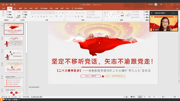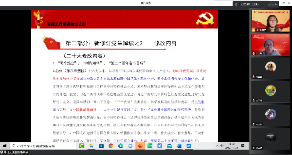 金融工程系师生党支部书记王江盼老师作为师生宣讲团成员为同学们讲解新修订的《中国共产党章程》。王老师通过对比分析的方式,讲解了党章的修订历程,普及了党员的权利与义务等相关知识,同时对青年学子提出了学思践悟的要求,强调在疫情之下更加要严于律己,保持自律,负重前行!