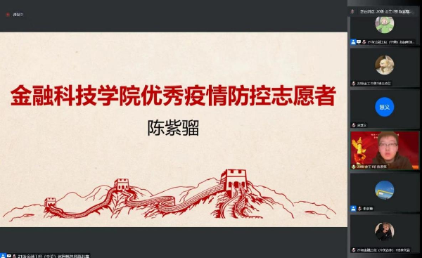 学院疫情防控志愿者代表陈紫骝在谈及本学期校园常态化核酸志愿者工作经历时,分享了同学们与老师们一起并肩作战的战疫奋斗经历,号召同学们做好个人防疫、积极参加校园疫情防控,齐心维护校园安全稳定。