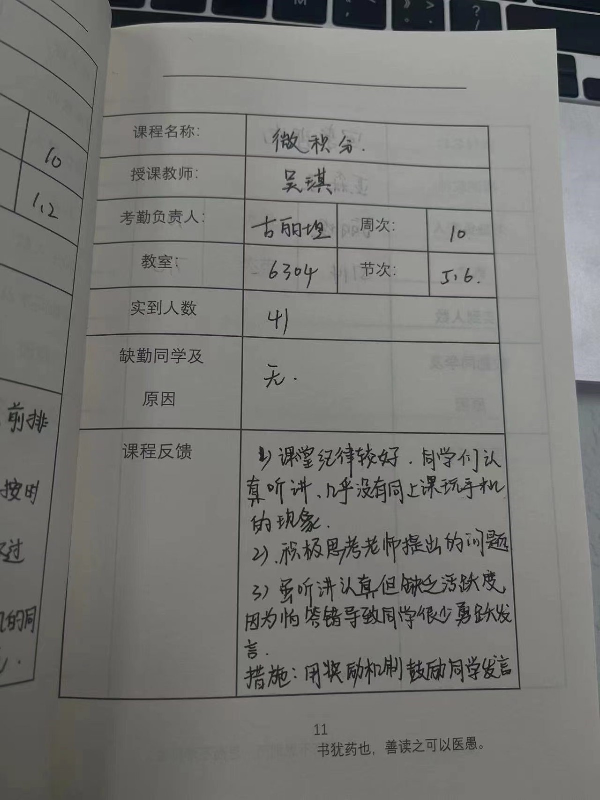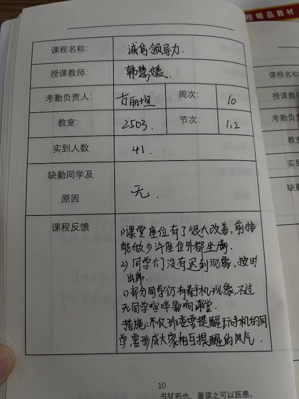 各班班长与学委带头组建班级学风自查小组,每天认真填写并及时上报课堂记录手册,反馈班级考勤、上课情况,展示各班良好的学习精神面貌。