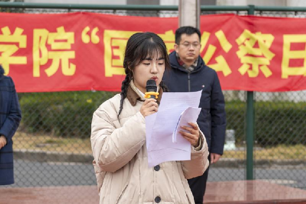仪式最后,由2023级学生代表赵蕴承、陈敏、刘乐湲、李千宸朗诵《勿忘国殇 实干兴邦》,用青年之声传递担当力量。