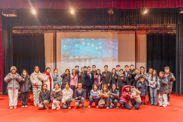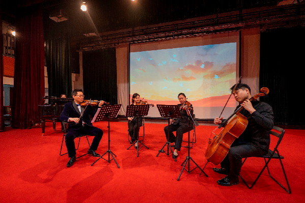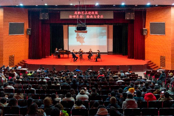 12月20日晚,我校上川路校区小剧场被温暖的艺术之光点亮,高雅艺术进校园《聆听色彩:绘画与音乐》专场精彩上演。上海歌剧院交响乐团副团长陈阳岳彤,携手张劭楠、孙扬、李光鑫、胡雨四位老师,为到场观众呈现了一场音乐与绘画的华美交响演奏。