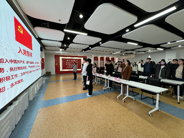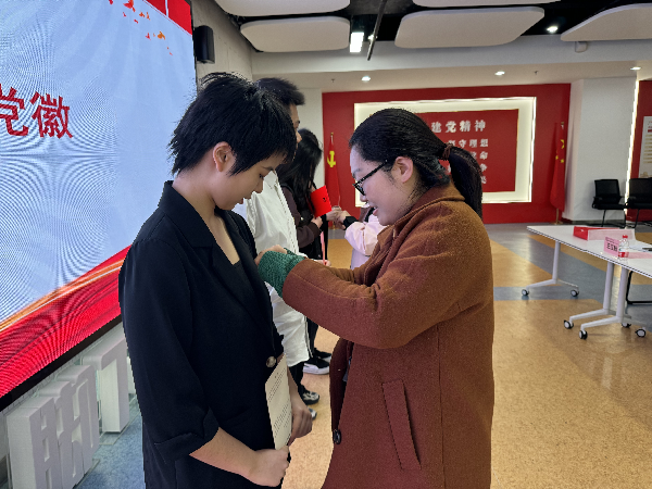 365上市公司党总支组织委员陶敏宣读了经学校党委批准的新发展党员名单。党支部书记为新党员们佩戴党徽,并颁发《入党通知书》。