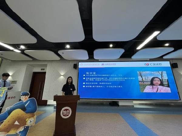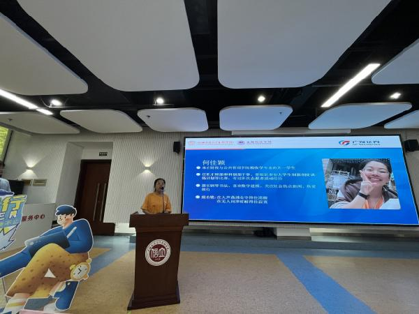 何佳颖、张吉家进行参赛感悟分享,她们对广发证券提供的赛事机会表示感谢,有感而发讲述在这5个月中对金融素养的提升及对投资理论与实践相结合的思考。何佳颖认为多看多想多听多学习多尝试是提升金融素养和投资判断力的重要路径,并鼓励同学们勇于尝试勇于探索。