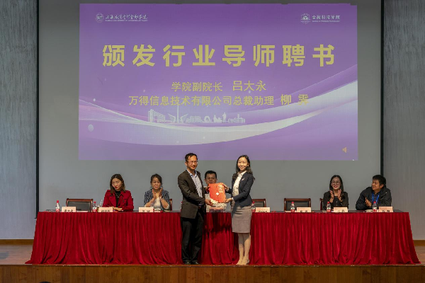 学院的发展离不开行业导师的支持与贡献,学院副院长吕大永为万得信息技术股份有限公司总裁助理柳霁颁发行业导师聘书。
