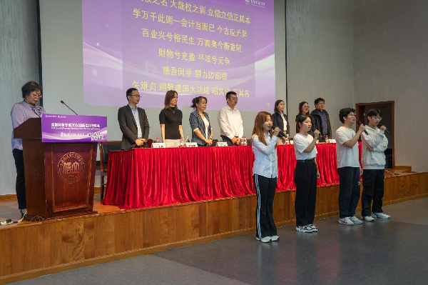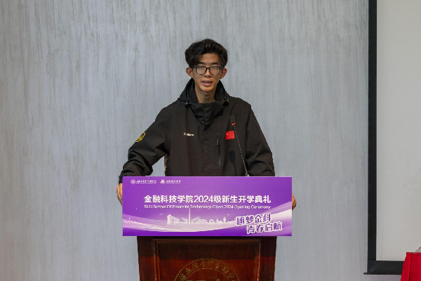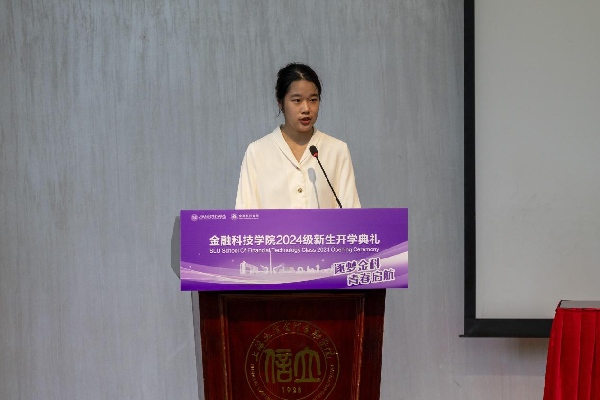 新生代表、2024级金融科技3 班吴昊琦代表全体新生承诺,将“立诚明德,经世致用”的精神牢牢镌刻在心中,将“民无信不立”的铮铮铁骨融进血肉,以青春之名,书写属于金科的精彩篇章。