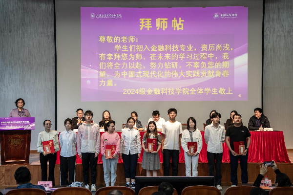 全体新生共同朗诵拜师词,向全程导师行拜师礼。