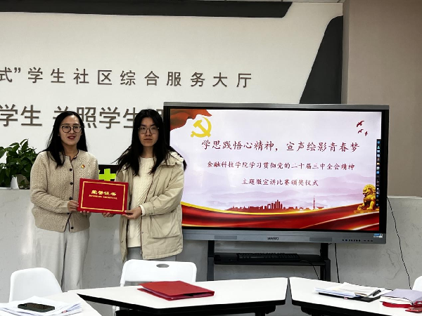 接着,由沈丹、张文鹏向“党的二十届三中全会精神微宣讲视频征集比赛”的获奖同学颁发荣誉证书。
