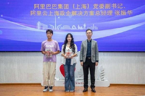 阿里巴巴集团(上海)党委副书记、阿里云上海政企解决方案总经理张振华向新生赠书,他希望新生们能积极参与AI创新大赛,通过学习尽快掌握了解AI发展趋势。