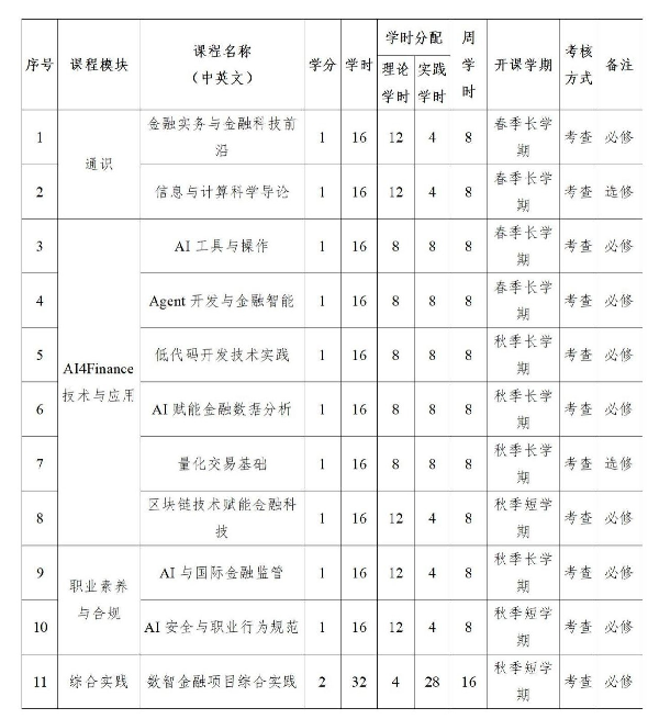 数智金融微专业共设置11门课程(9门必修,2门选修),具体如下:
