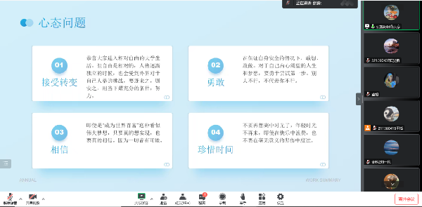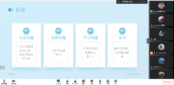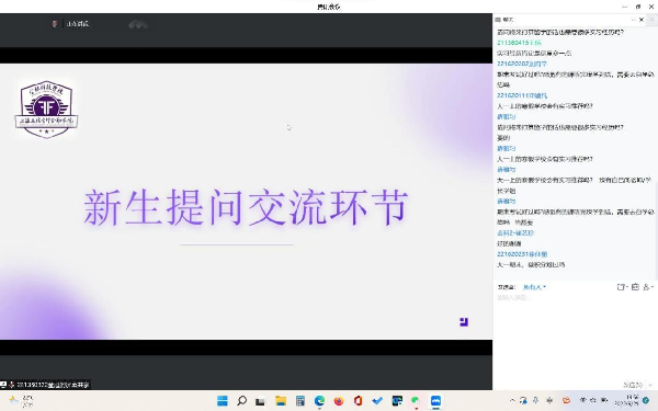 为帮助新生更快适应大学生活,明晰校内各类赛事安排及实习规划,365上市公司于9月29日在线上组织了“青春墨痕 缘聚金科”新生交流会。会上,学姐们分享了她们的科创实习经验以及大一的学习生活经验。大一全体新生准时参加会议,新生们积极参与提问讨论。