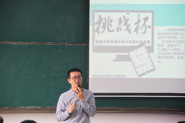 在首次培训开讲环节,魏晓雨老师进行了赛事指导。魏老师鼓励学生踊跃参加科创性比赛并向参会人员介绍了大挑及其含义,并在此基础上讲述了参赛作品分类、科创性课题及创新型课题的选择流程、调研方法,科普了项目选题思路及选题误区。他以实例讲述大挑作品选题途径,并通过对科技发明制作类创新项目进行案例分析,让同学们了解其中的创新点、研究思路等。