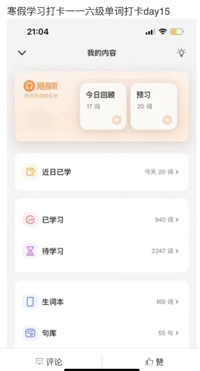 也恭喜曾凝灵、张瑗、赵玉珊、侯馨怡等21位同学,在本次寒假打卡活动中不仅坚持到了最后,完成了所有的打卡任务。希望大家在新的学期里能够更加努力,新学期我们一起加油!