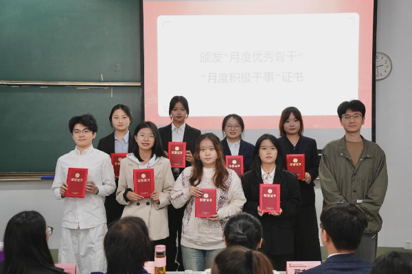365上市公司金融科技系学生党总支书记朱亚楠为第六届团委学生会优秀干事颁发证书。