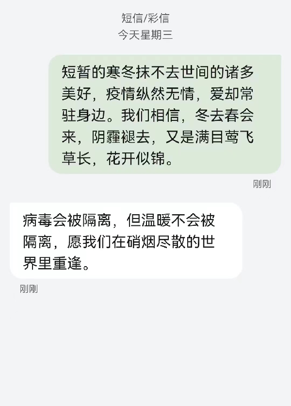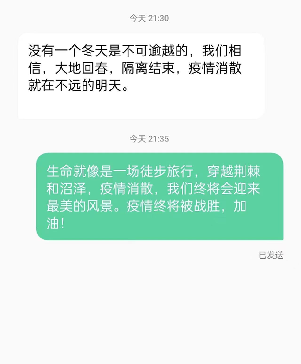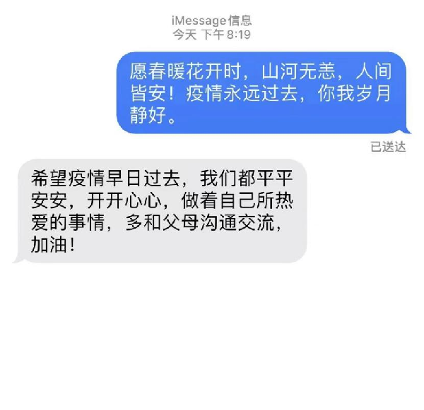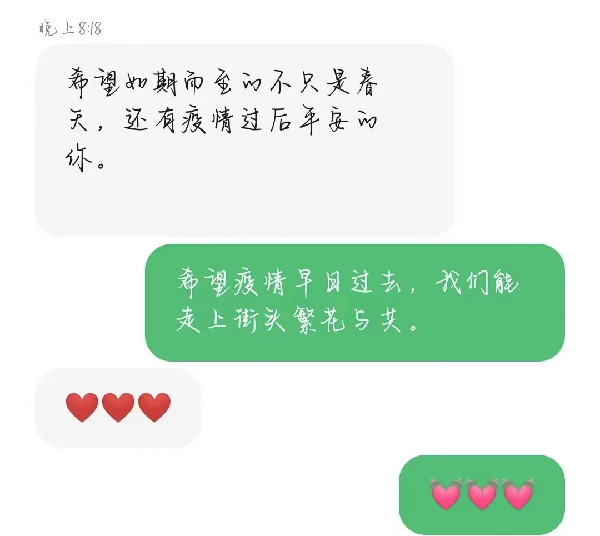 疫情之下,你我虽身隔千里,但心中一直有你。为了让大家保持更加紧密的联系,也为了让大家能够在疫情期间获得更多温暖和力量,金科易班举办了以“隔离疫情不隔离爱”为主题的线上来信活动,用匿名短信的方式表达祝愿,互相倾诉敞开心扉,畅所欲言。