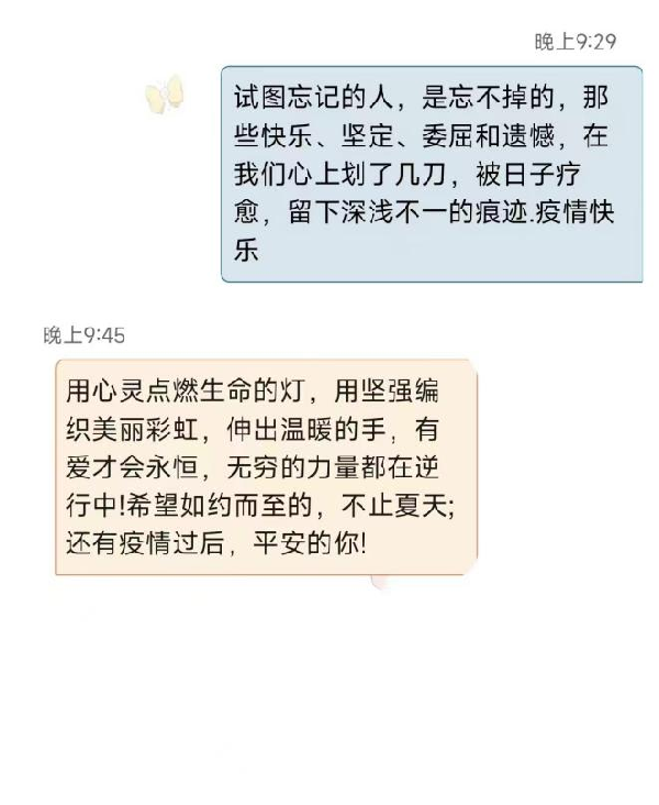活动中,同学们积极参与,互相倾诉,互相慰藉,用暖心的话语,鼓励着对方,让你我之间的距离不再远隔千里。身处疫情,但心向美好。“期盼着你安好,期待着与你再见。”“愿你像向日葵一样,永远面向阳光”“疫情会被隔离,但爱不会”,一句句温暖的话语,让你我心灵得到慰藉。在这春夏交替之际,让你我共同期盼,期盼着美好的明天。