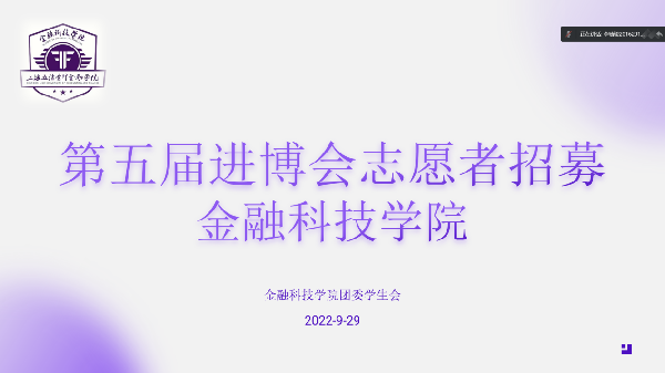 第五届中国国际进口博览会将于2022年11月5日-11月10日在上海举办。为积极响应上海团市委工作总体部署,按照我校团委《立信会计金融团发〔2022〕28号 关于招募选拔第五届中国国际进口博览会志愿者的通知》要求,我院团委顺利开展志愿者招募工作。365上市公司团委以线上腾讯会议的形式举办了第五届中国国际进口博览会的志愿者面试,由学院教师与2021年进博会志愿活动的小叶子组成师生评委团。